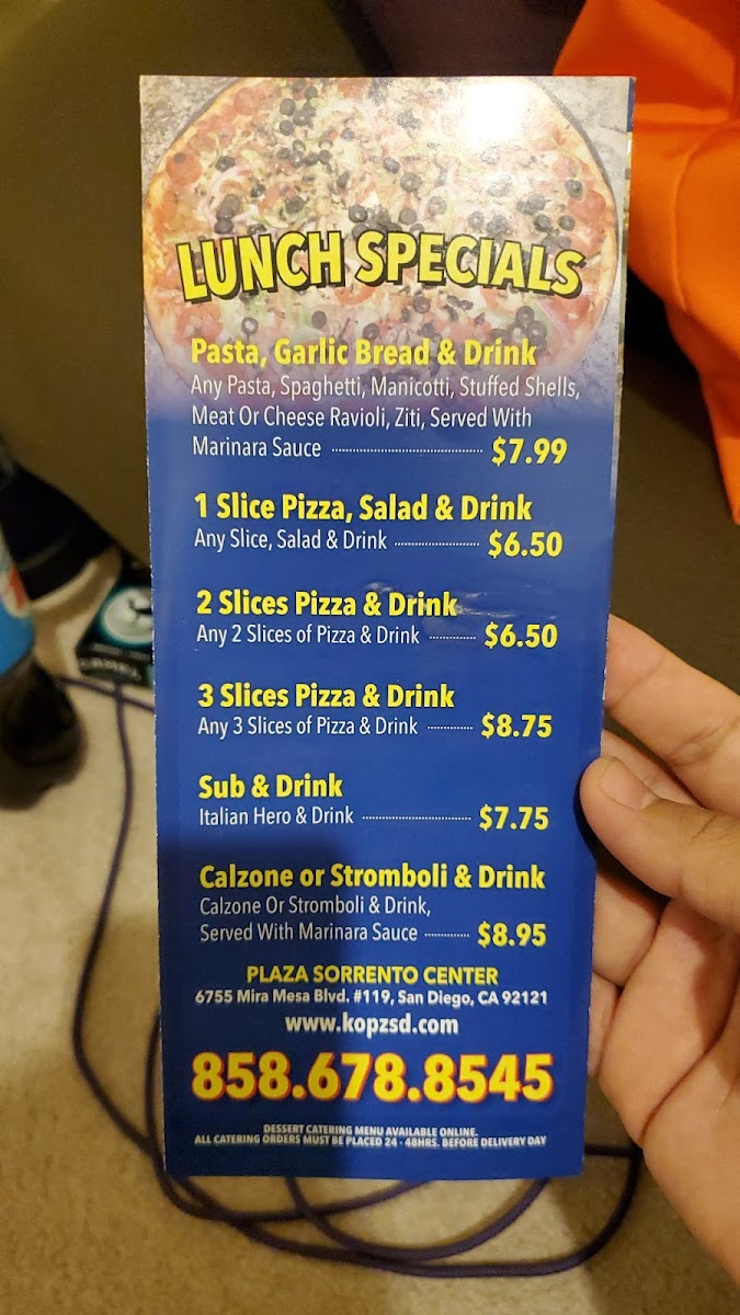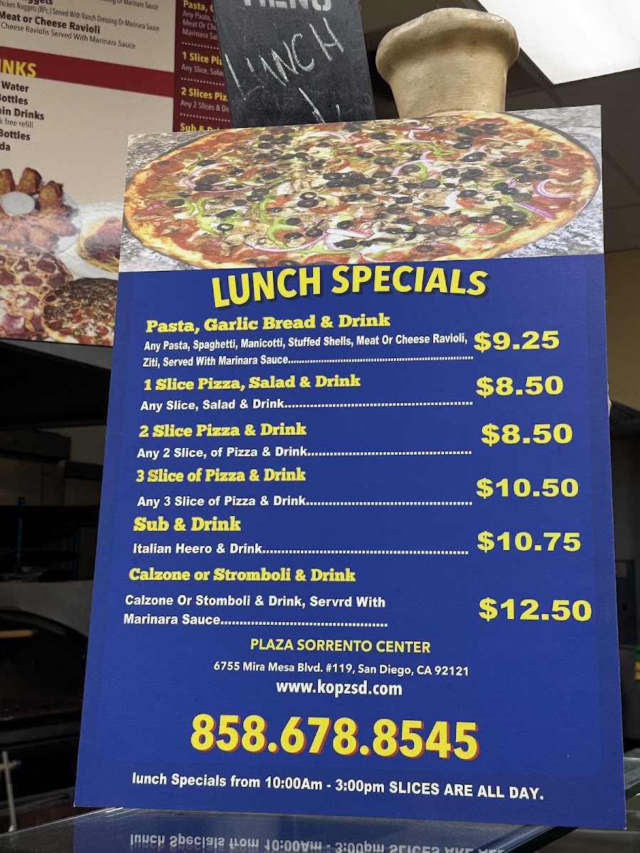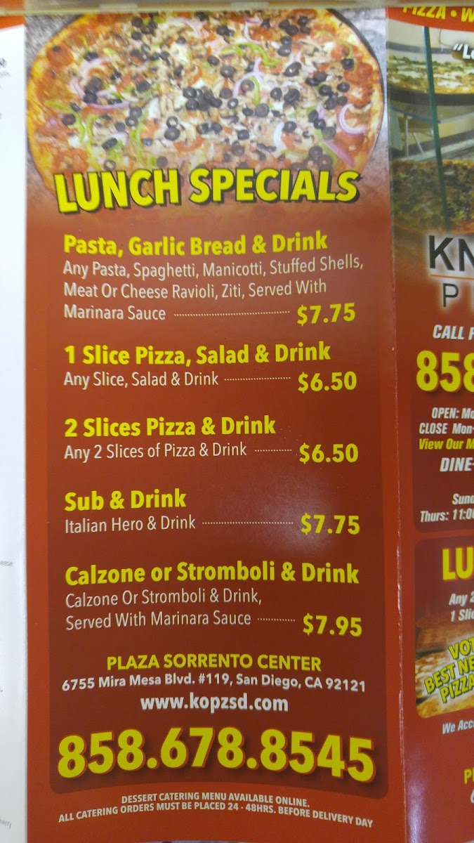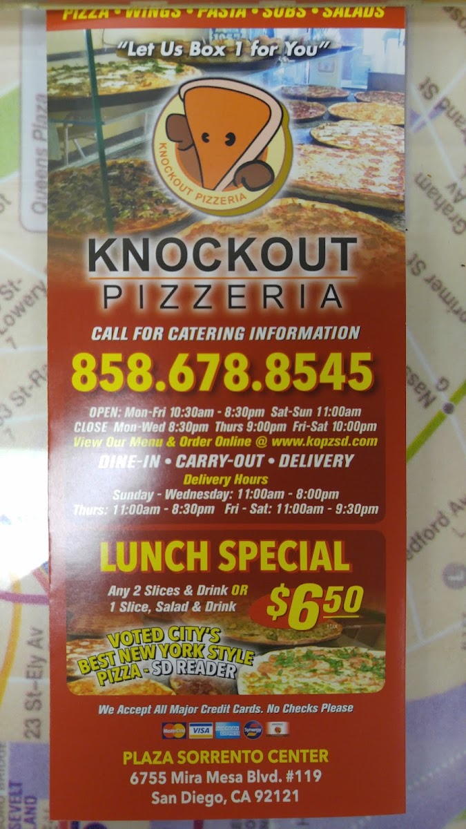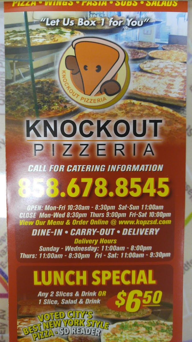 Welcome to Knockout Pizzeria, a hidden gem located at 6755 Mira Mesa Blvd #119, San Diego, CA. This restaurant offers a delightful take on classic East Coast-style pizza, with both Sicilian and New York options that are sure to satisfy. Each slice captures the essence of traditional Italian flavors, featuring fresh dough and abundant toppings. The crispy yet chewy crust is a highlight that leaves many returning for more.